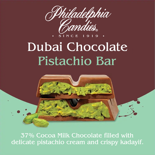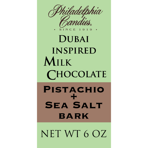 Philadelphia CandiesIn stockMilk chocolate bark made with dry roasted pistachios and sea salt. Dubai chocolate inspired recipe. Pistachios grown in the USA. Ingredients: Milk ...