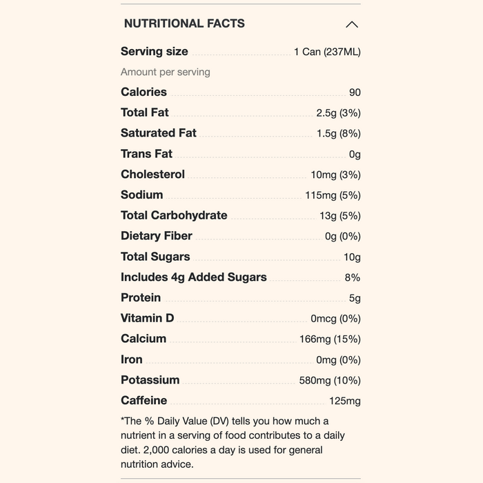 Ingredients: 2% Milk, Coffee (Water, Coffee), Sugar, Vanilla Extract, Natural Flavors, Honey, Dipotassium Phosphate, Acacia Gum, Gellan Gum